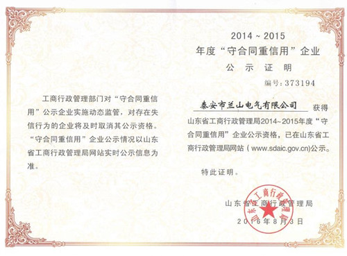 2016年8月3日,我公司荣获山东省工商行政管理局颁发的2014-2015年度“守合同重信用”企业称号。
