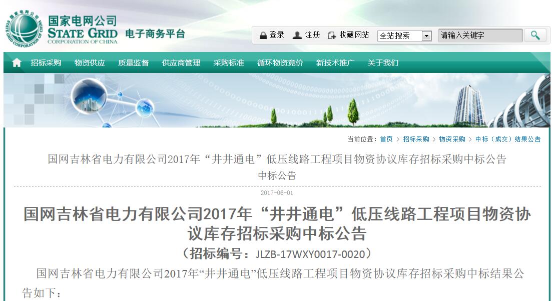 2017年6月1日,公司参与国网吉林省电力有限公司2017年“井井通电”低压线路工程项目物资协议库存招标采购,成功中标,为公司进军国家电网迈出了坚实的一步。