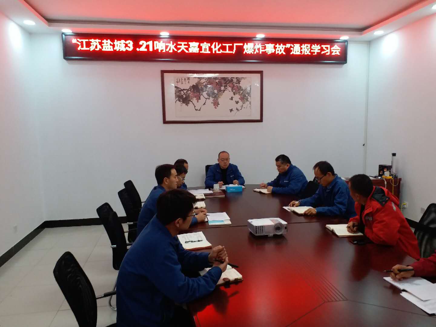 会上,通报了2019年3月21 日江苏响水天嘉宜公司特别重大爆炸事故情况,传达了习近平同志、李克强同志重要批示精神,要求各部门深刻汲取事故教训,按照各级政府、上级单位要求立即开展隐患排查工作,有效遏制安全生产事故,保持安全生产稳定局面。